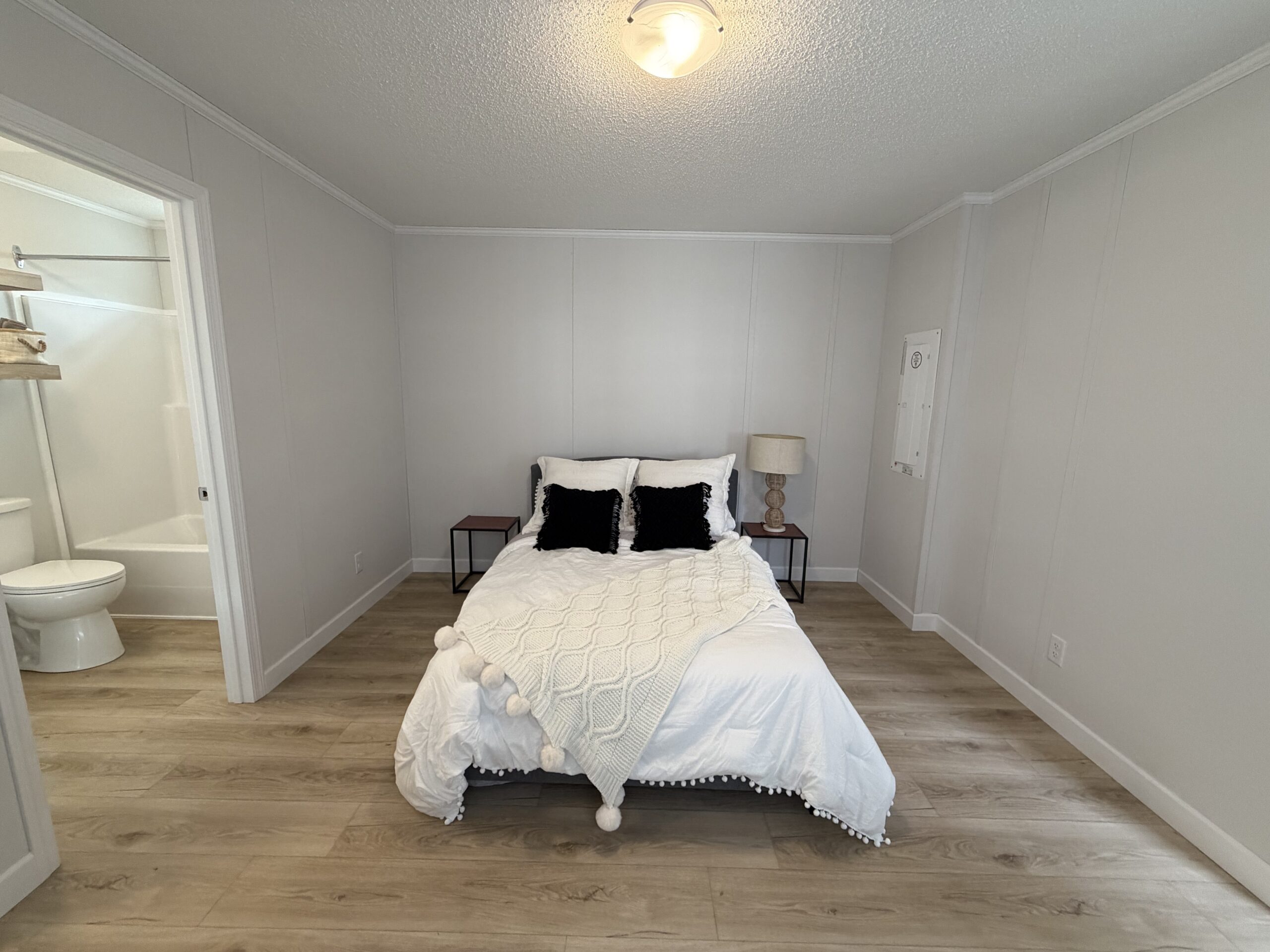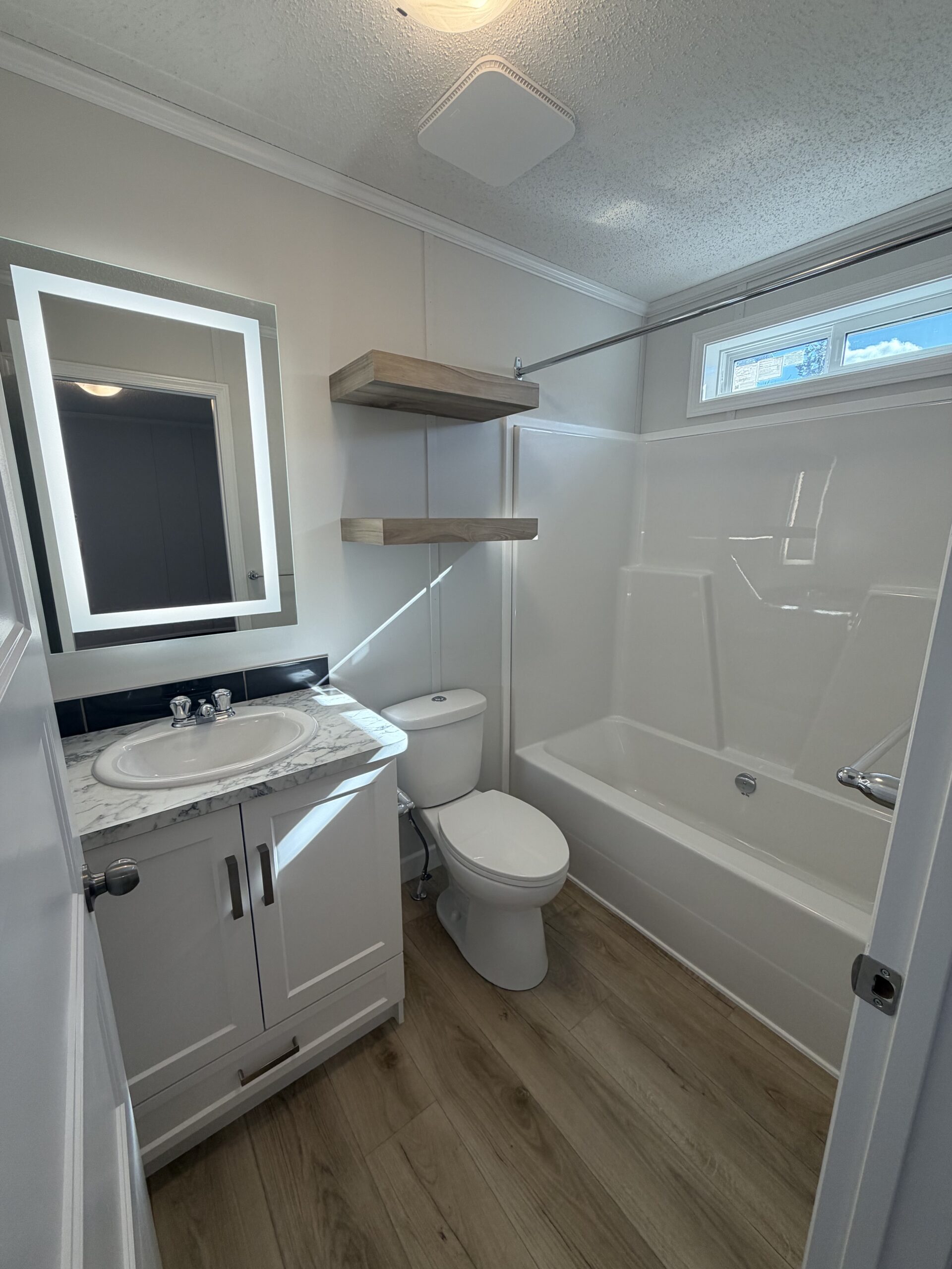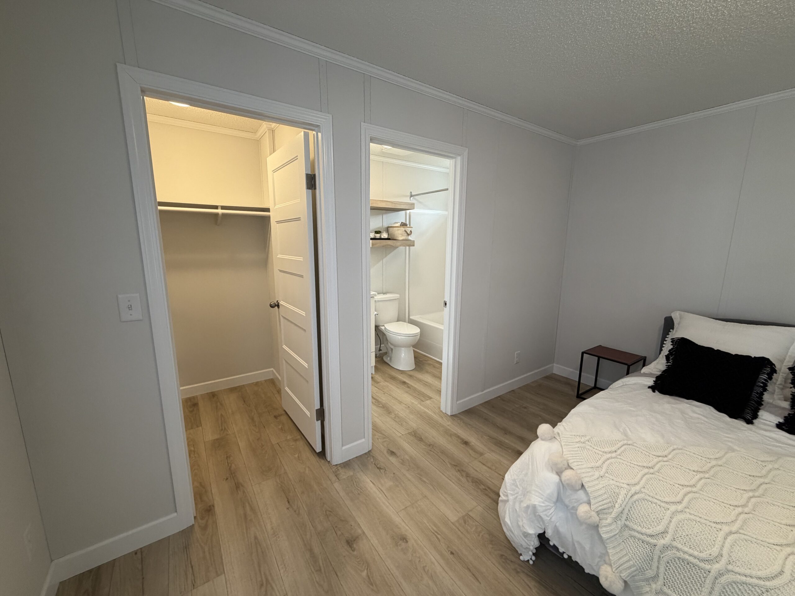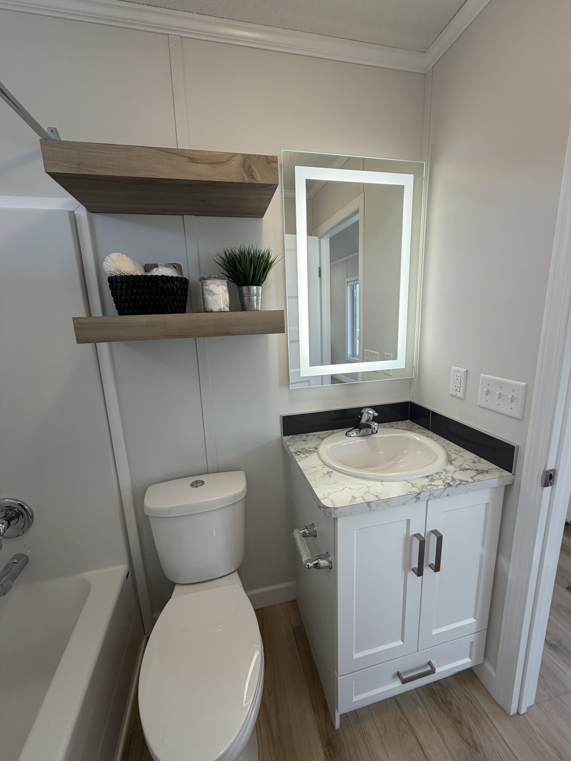 - Floating shelves over toilet in both baths