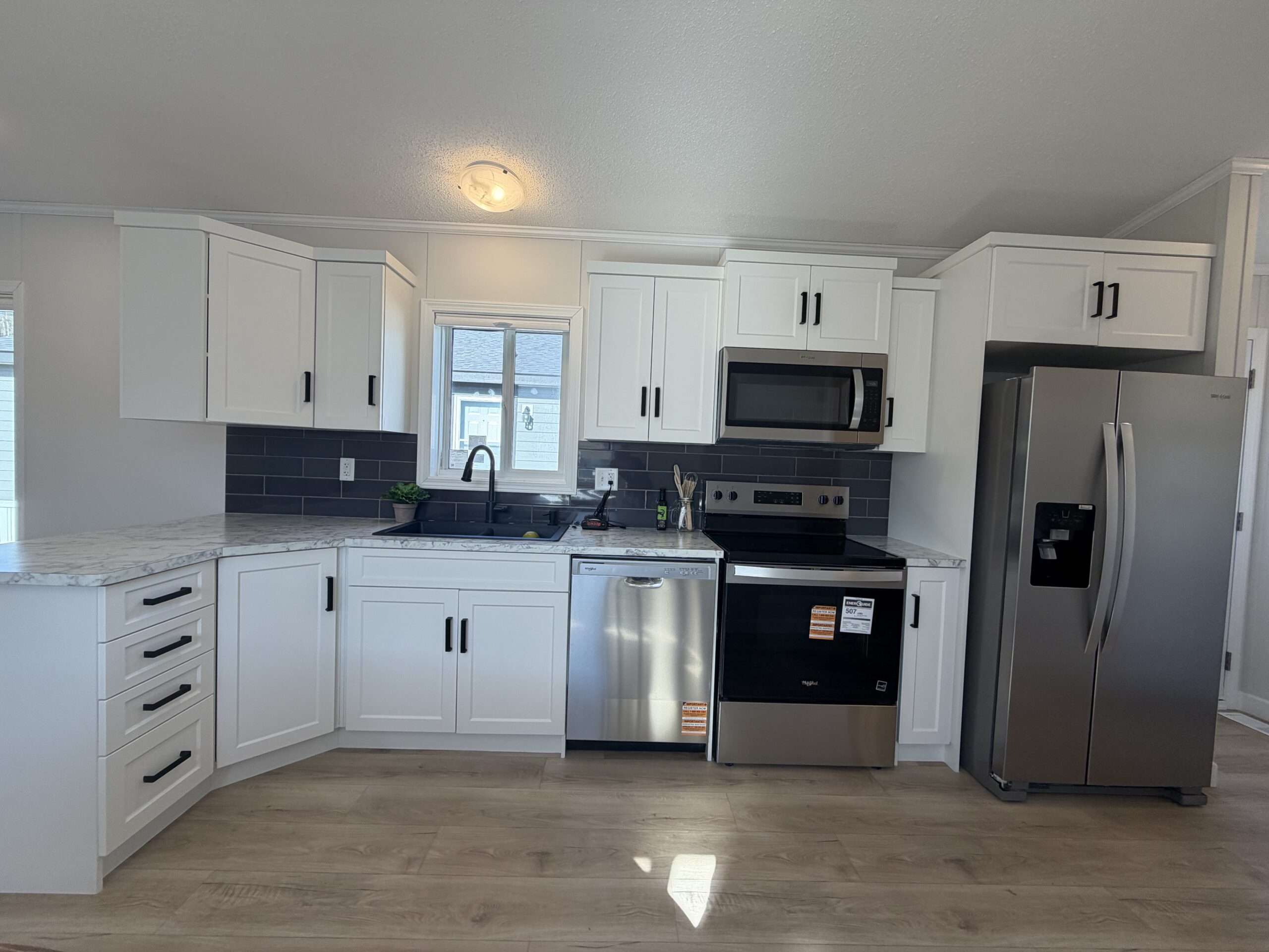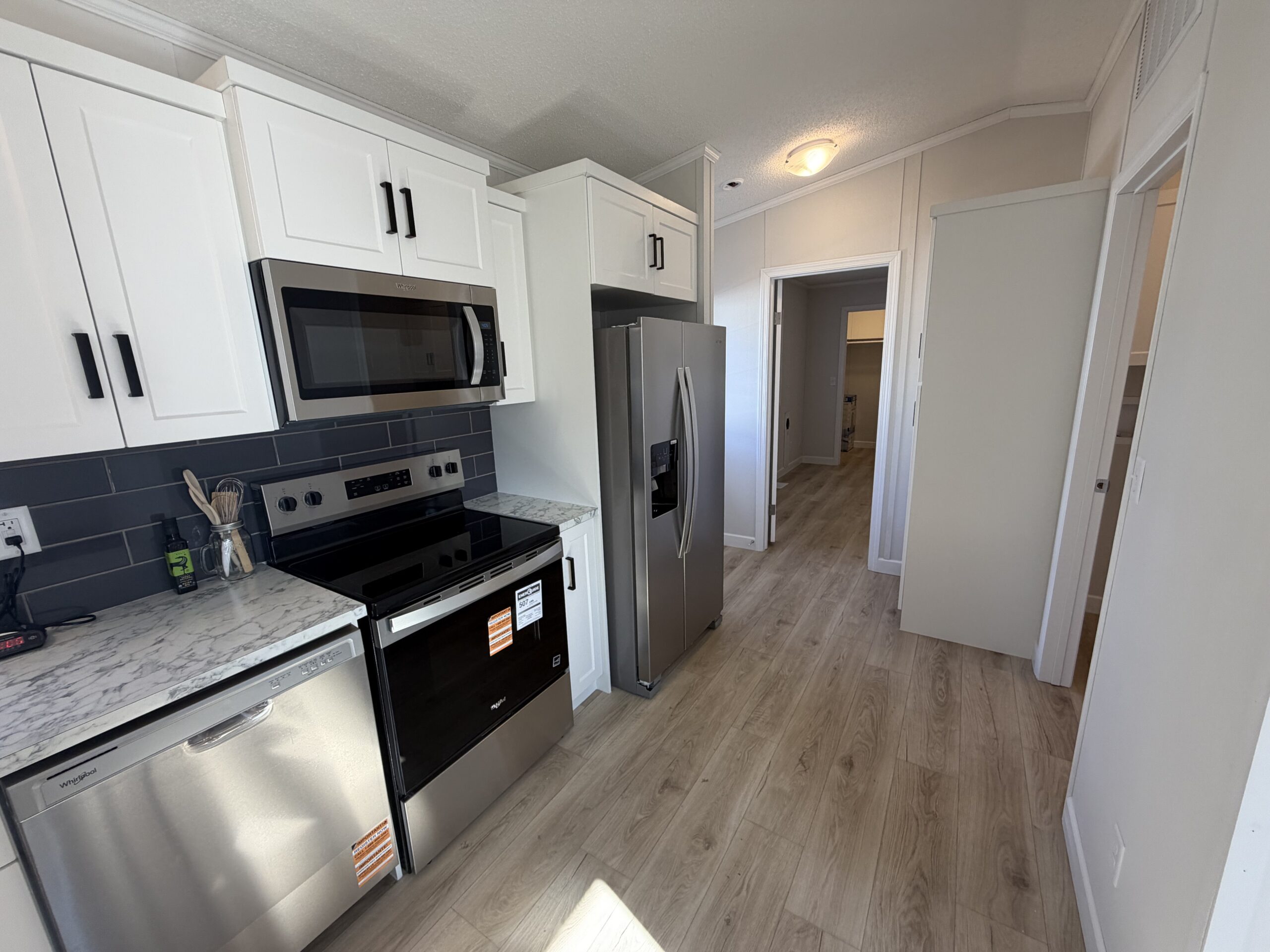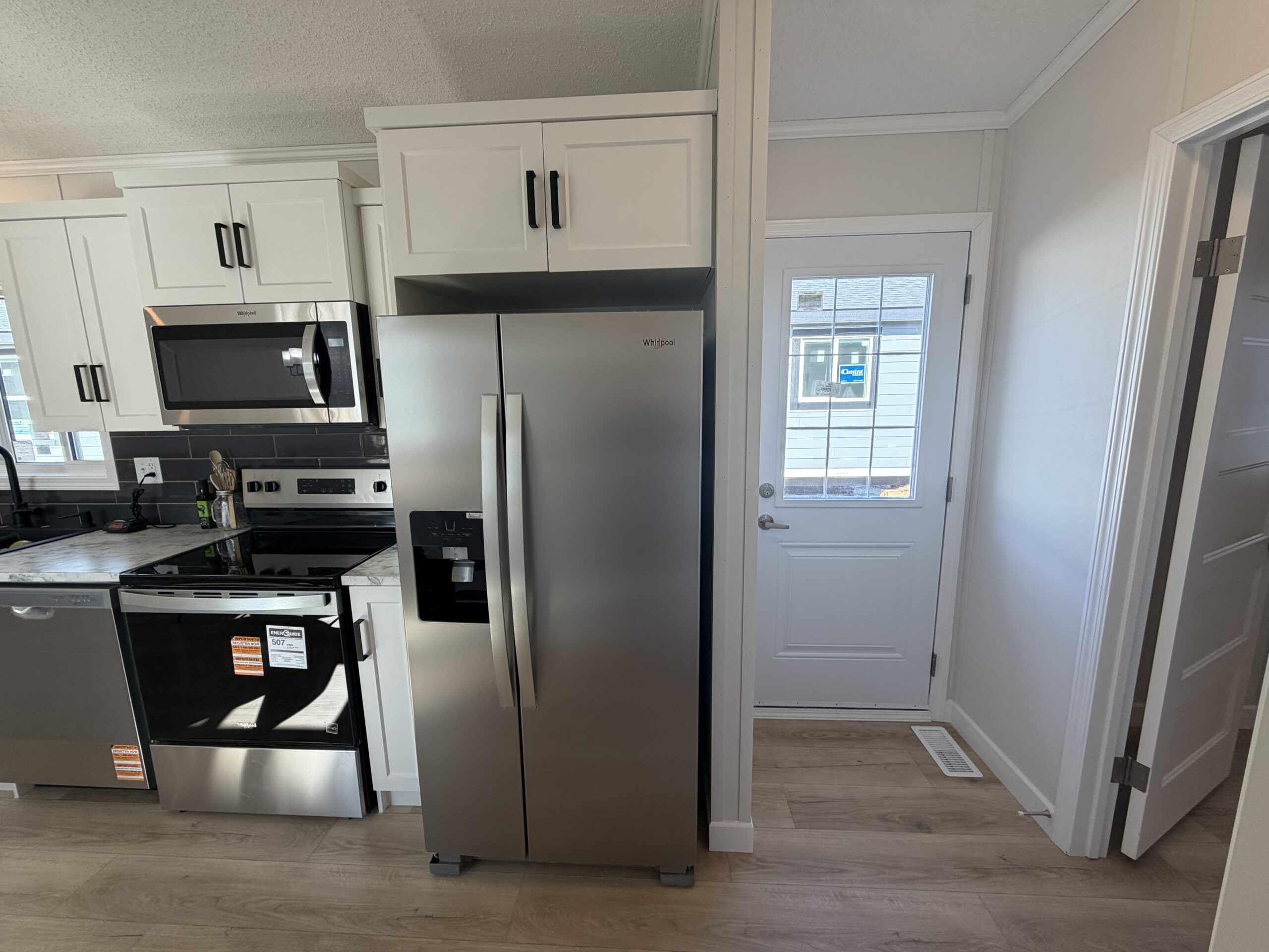 - Side by side fridge, range, dishwasher, microwave range hood fan